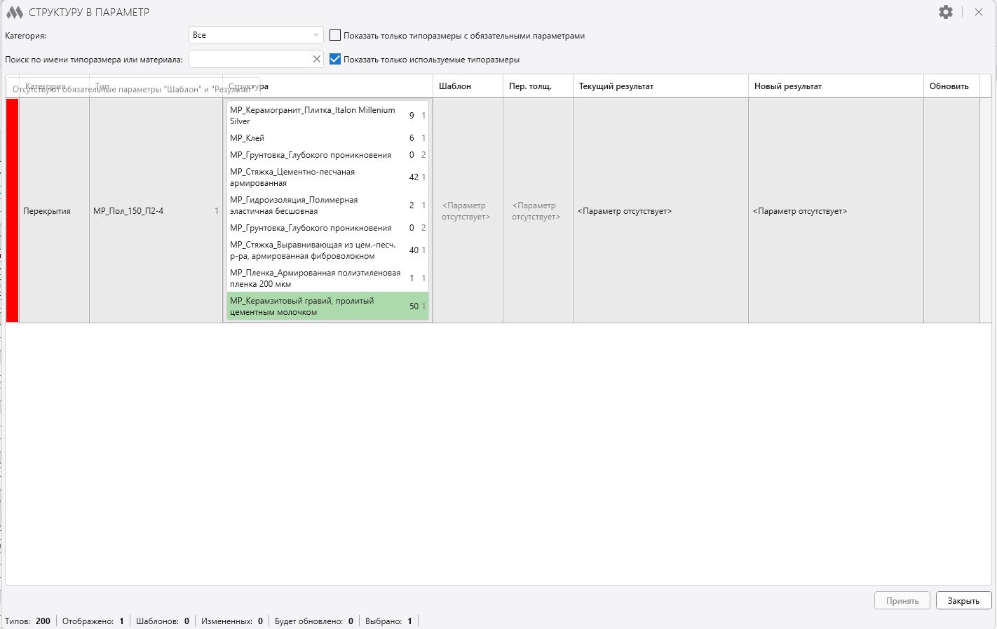 Здравствуйте. Пока ни чего не работает! Согласно описанию добавил необходимые параметры как параметры типа видит только существующую структуру обновить нет галки, принять не активна. В видео показана немного другой плагин где есть параметры типа и экземпляра. В итоге вообще ни чего не понятно. Прошу уточнить параметры Шаблон, Результат, Переменная толщина типа или экземпляра
