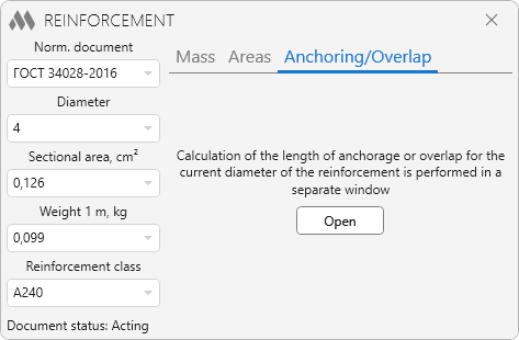 1. In the left part there are elements for selecting reinforcement (normative document, diameter, area, weight 1 pm, class of reinforcement)