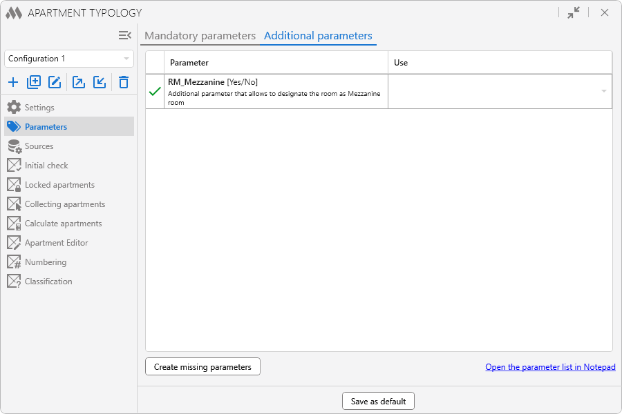 Apartment identifier – sets the value of the "Functional purpose" parameter, by which the rooms to be processed will be defined. You can specify multiple apartment identifier values separated by semicolons without spaces. The default value is "Apartment".