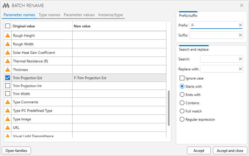 Batch renaming of parameter names, type names, parameter values in the specified families
