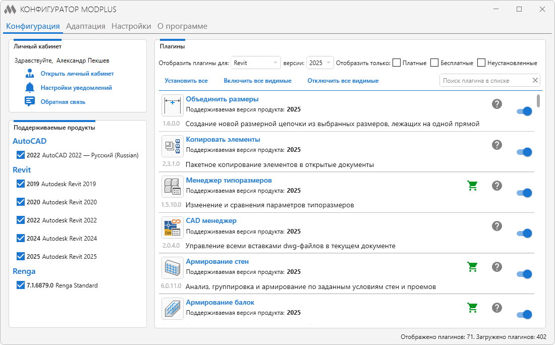 Один из компонентов ModPlus, позволяющий управлять подключением к поддерживаемым программам, управлять плагинами (устанавливать, отключать или включать), изменять настройки адаптации и основные настройки ModPlus.