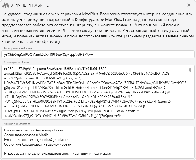 Работа личного кабинета может отличаться в зависимости от наличия доступа к сайту и веб-сервисам ModPlus (или доступа к сети internet в целом).