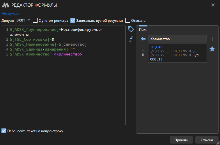 - добавлено извлечение из формулы всех выражений в двойных кавычках перед проверкой и обработкой. Т.е. теперь вы можете писать в формуле выражения в двойных кавычках, включающие управляющие символы, и не переживать об их экранировании. Например, «(Остекленное)», «Тип А,2» и т.д. Кроме, конечно же самой двойной кавычки, которую надо экранировать в этом случае – «Тип \«А\»».