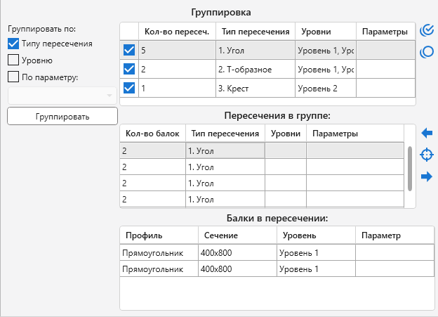 В зоне группировки располагаются три таблицы. Верхняя заполняется группами пересечений балок. Для каждой группы в списке по умолчанию проставляется флажок, означающий, что для данной группы пересечений балок требуется выполнить армирование.