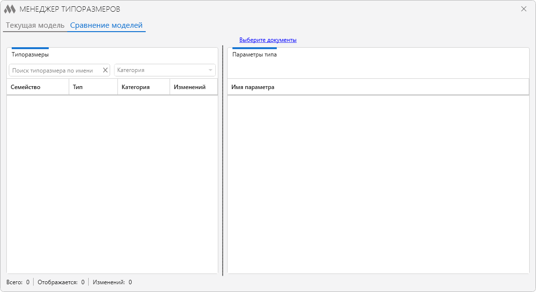 В нижней части окна плагина расположена строка состояния, отображающая общее количество типоразмеров, количество размещенных в модели, отображаемых и выбранных типоразмеров.