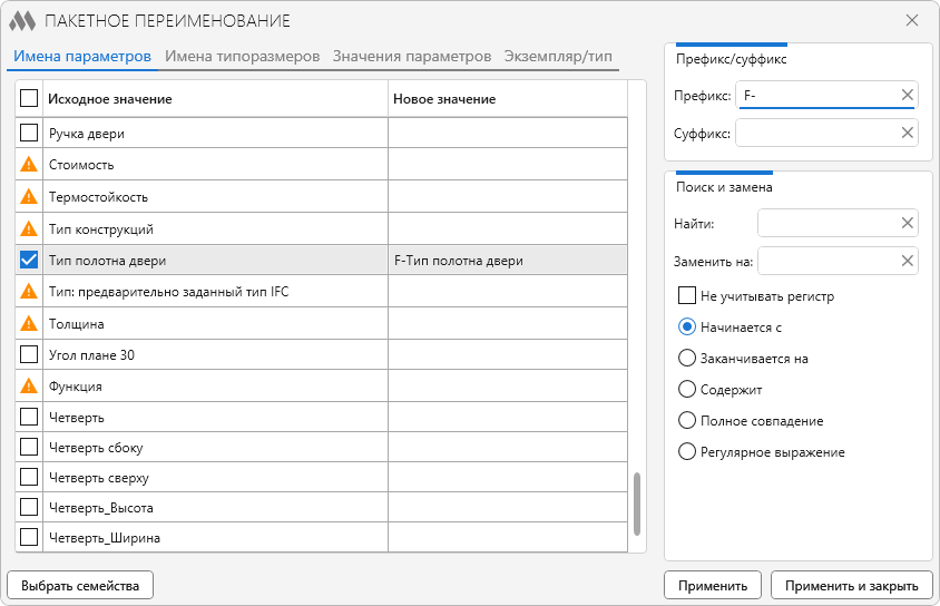 Пакетное переименование имен параметров, имен типов, значений параметров в указанных семействах
